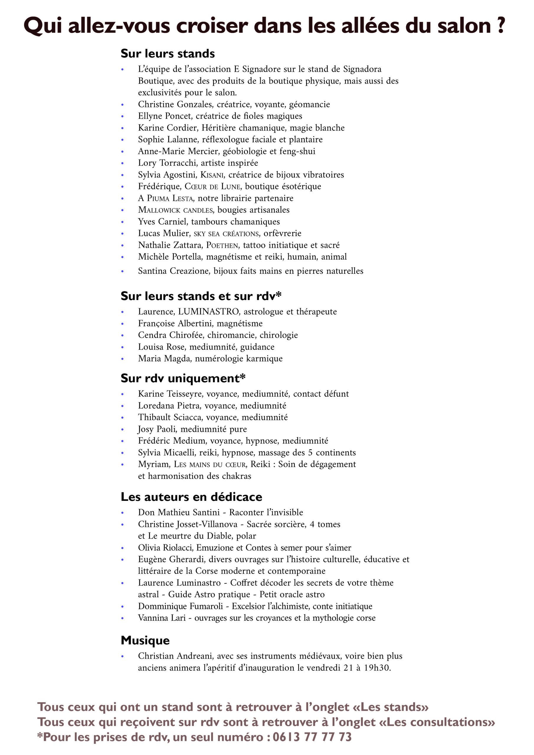 L'associu E Signadore v'invita à apre e porte d'un universu di magia è di fede mischjate, di stelle è di segnuvali, di fate è di manduvini, frà quattru ghjorni di festa, di spartera è di scuperta.